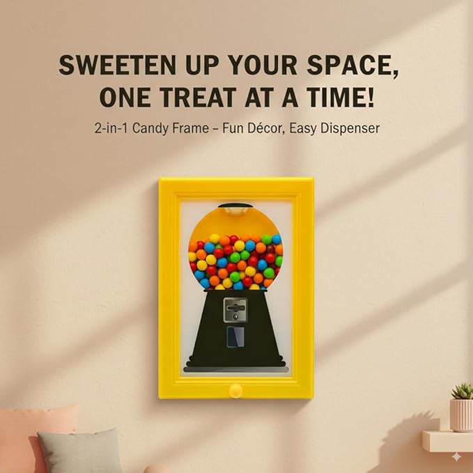 Candy Frame er en fargerik interiørdetalj med leken retrofølelse. Den kombinerer klassisk gumball-design med moderne interiør og gjør godteri til en naturlig del av stilen. Heng den på veggen eller plasser den på en hylle – like fin på kjøkkenet og i stuen som i spillrom eller barnerom.